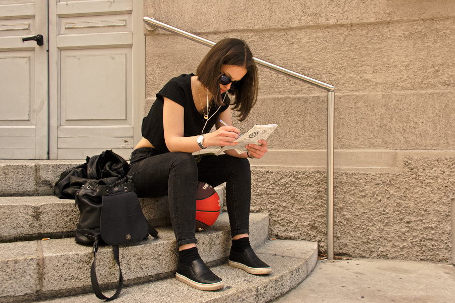 Tu non vedi altro che una ragazza, un pallone e una settimana enigmistica. E ti sembra poco? Il titolo richiama attività di tempo libero per l'appunto, anacronistiche. Documentare tale attività ha un senso, è il senso di questa foto (e così rispondo anche all'osservazione di Vittorione).