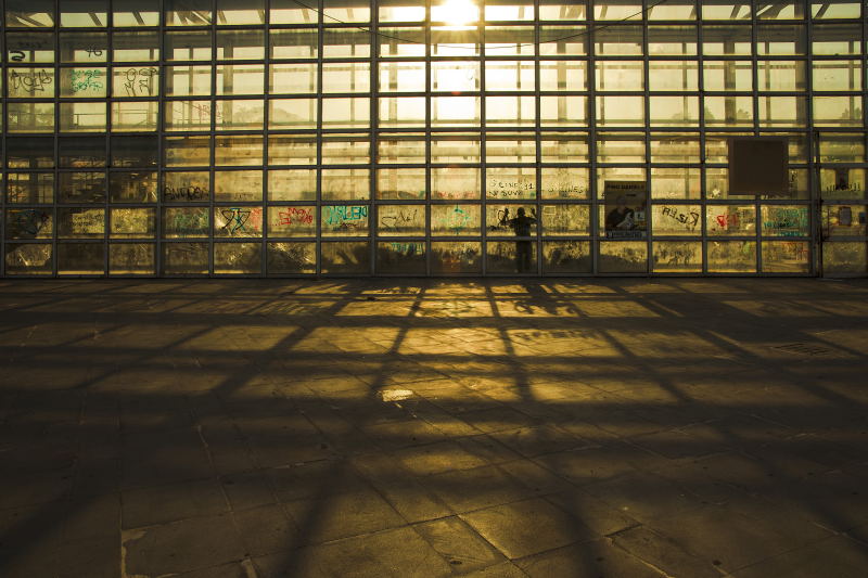 Il sole che filtra, disegna, contorna e riflette la struttura e la sagoma appoggiata dietro quella vetrata lineare e ossessiva, dà luce alla scena che rimane , tuttavia, inquietante, suggestiva e surreale. Molto ben pensata ed eseguita, e vedo dalla Tua galleria che questo non è un caso isolato, ma un Tuo modo peculiare di fotografare.