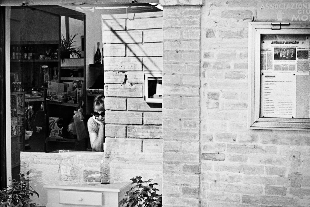 Eccessiva, secondo me, la porzione di muro a destra;la bacheca tagliata non appaga in termini estetici e funzionali il racconto. Era il caso di spostare la ripresa sulla sinistra,adottando al limite un taglio verticale, decentrando la donna sulla destra del fotogramma. Così com'è si potrebbe provare una crop, soluzione estrema, tuttavia, considerando che dovrebbe eliminare quasi un terzo della foto.