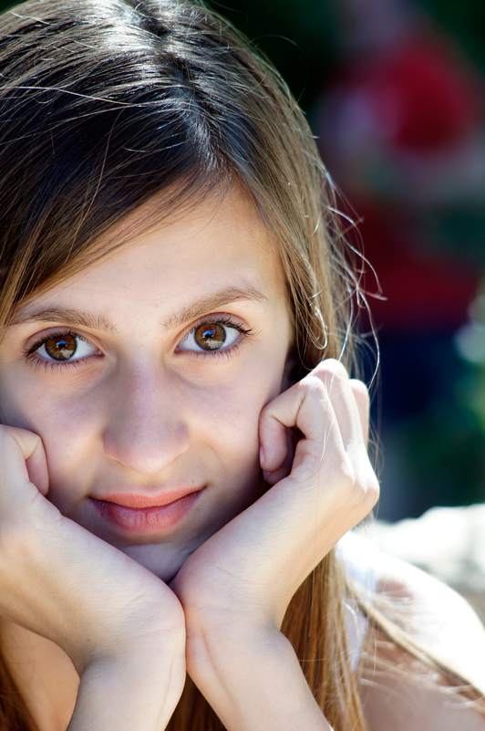 Come brillano quegli occhi che paiono riflettere una danza di luce e fanno da cuore emozionale di una espressività partecipe da parte di Ludovica ...consapevole dello scatto, ...eppure leggermente sospesa, come se lo scatto l'avesse colta di sorpresa, con il cuore ancora legato ad un pensiero intimo e segreto.