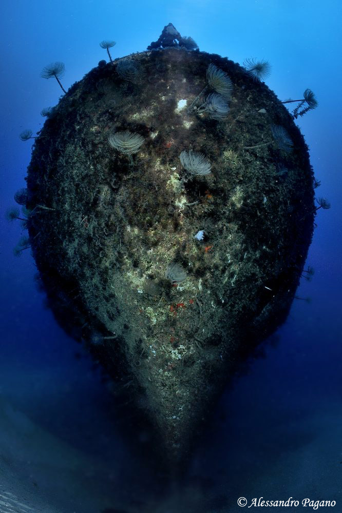 La prua del dragamine P29, vista da sotto, affondato davanti alla costa maltese.