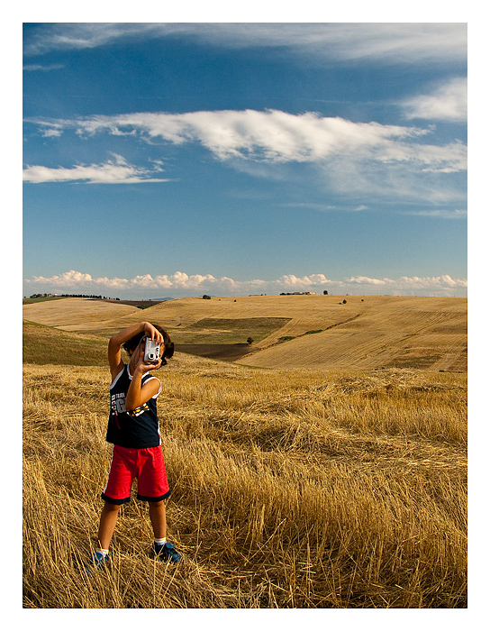 Una nota simpatica rappresentata dal "fotografo provetto", in un bellissimo paesaggio dai caldi colori e dall'atmosfera struggente e serena.