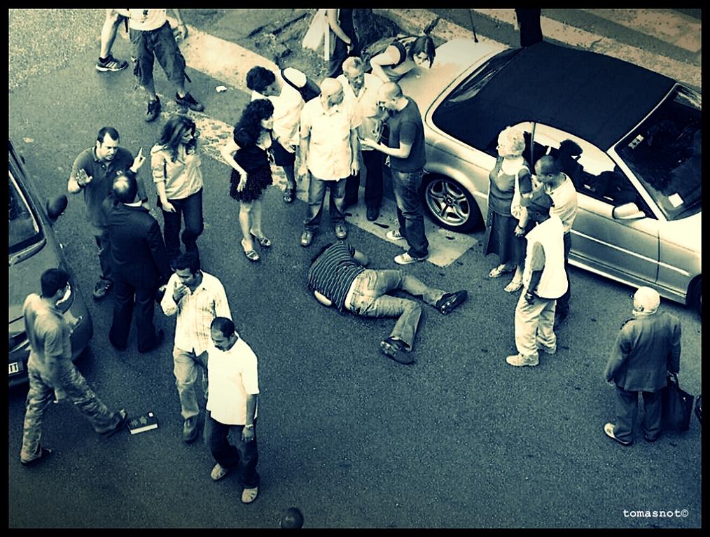 Non si puó’ fare a meno di notare il fatto che la maggior parte dei presenti non sembri prestare molta attenzione alla persona a terra e soprattuto nessuno le presti soccorso.