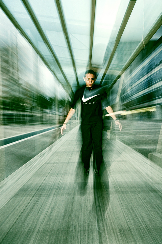 La post è solo sul colore e sui contrasti, l'effetto è stato ottenuto on camera: macchina sul cavalletto, colpo di zoom contestuale all'utilizzo di 2 flash esterni, tempo di scatto credo attorno a 1 secondo. Ho fatto altre prove utilizzando un carrello per fare una sorta di tracking del ragazzo che correva, magari più tardi li posto.