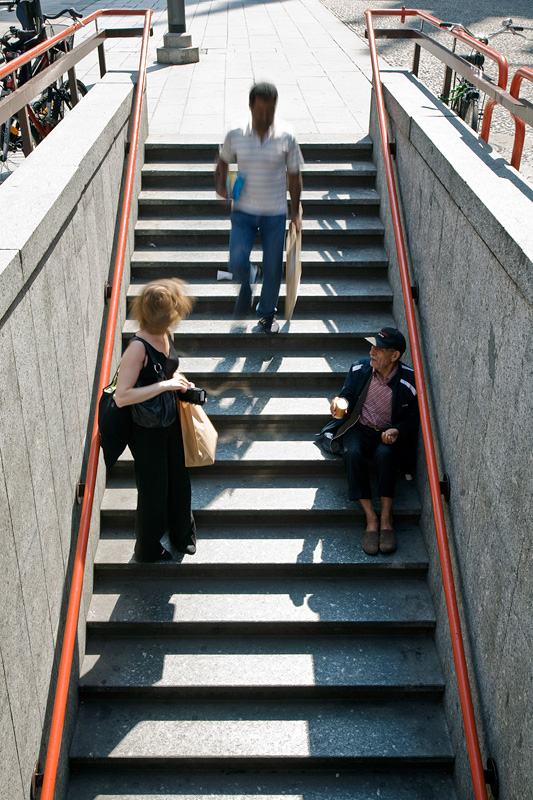 In pochi particolari una storia: l'interazione tra la signora e il vecchietto è nelle mani dei due: quelle maschili nel gesto di chiedere, quelle di lei cercano nel portamonete. Il rapporto tra la signora e l'uomo che scende invece è nel mosso delle teste: la donna si gira, come colta in fallo; l'uomo metropolitano ha fretta, non si ferma nell'incontro. _________________ Las penas y las vaquitas / se van por la misma senda |