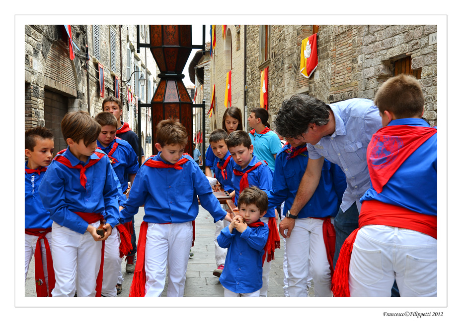 Il piccolino (tra l'altro mio figlio) alle prese con le prime "fatiche" della vita (Festa dei ceri piccoli di Gubbio) e tutti (o quasi) i soggetti che gli sono intorno che lo guardano con un misto di curiosità e apprensione.