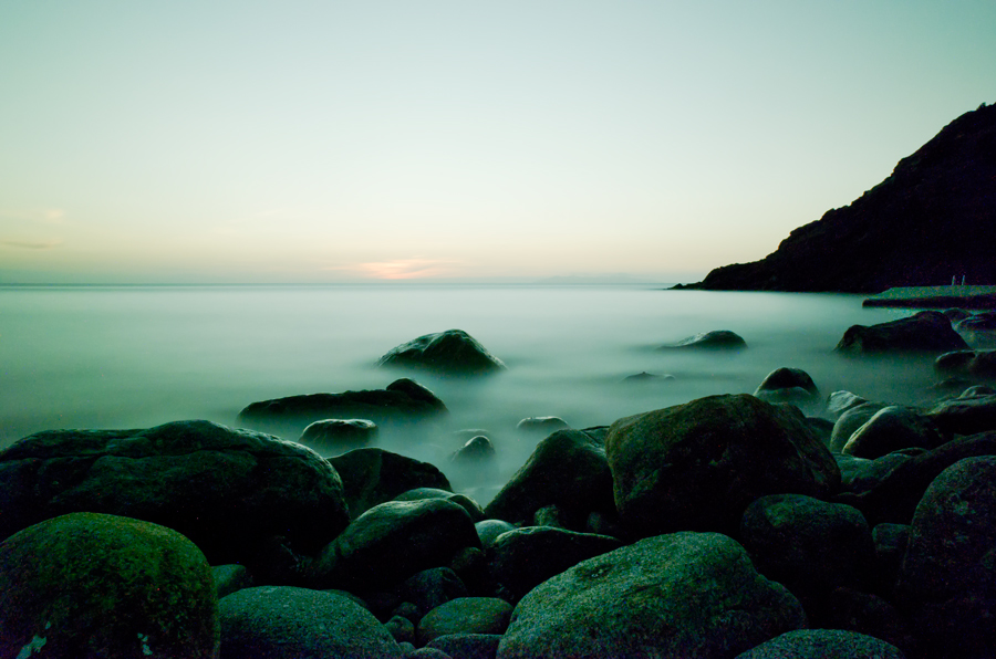 L'attenzione è spostata tutta sul quel primo piano "acidulo" che man mano dirada sulla destra verso i toni scuri, invertendo la percezione tipica del paesaggio marino che vuole il tramonto e il luccichio colorato come protagonisti. Hai usato quel tipo di saturazione che apprezzo tanto e non solo nel paesaggio (penso al Tuo grande ritratto!).