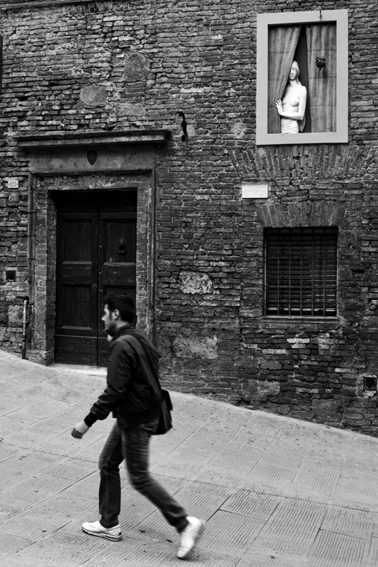 In questo caso, dove il "grosso del lavoro" l'ha già fatto chi ha piazzato la strana creatura che sbircia dalla finestra , dal fotografo ci si dovrebbe aspettare uno sforzo in più: la ricerca di un'ulteriore, più forte o più originale interazione/assonanza tra la figura alla finestra e la vita in strada.
