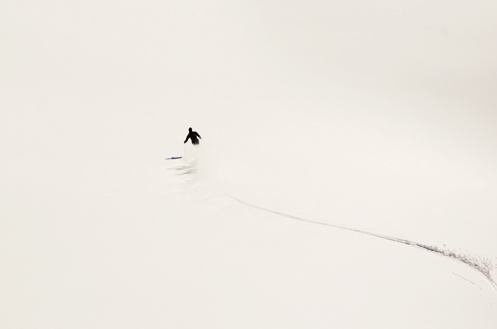 Immagine immacolata, la gestione del bianco é funzionale alla percezione dello spazio, definito da una linea che parte destra all'immagine, con dei frammenti di neve che scavalcano il manto bianco, trasformandosi in taglio ondulato, verso un onda soffice alzata dal passaggio delle lamine, per giungere alla figura umana (peccato per la poca definizione) e terminare con la sua ombra. Poi lo spazio.