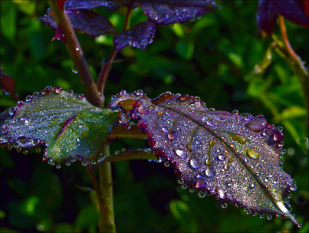 avrei, forse, limitato l'inquadratura sulle due foglie in basso, cercando di avere più prodondità di campo possibile per avere nitidezza di tutta le goccie sulla foglia di dx.