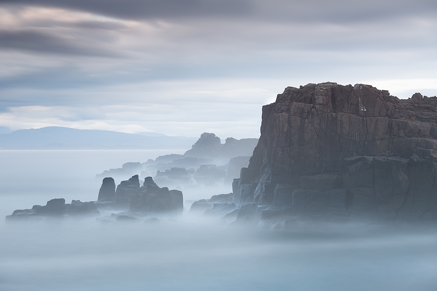 La bellezza di questa fotografia sta nel graduale passaggio dalla eterea dissolvenza del mare alla imponenza ed alla forza della scogliera. La luce tenue e diffusa dal cielo nuvoloso e la focale lunga che avvicina i vari piani anch'essi progressivamente piu' eterei verso l'orizzonte, contribuiscono a creare un'atmosfera magica. Un bel esempio di Fotografia Paesaggistica fuori dai canoni usuali.
