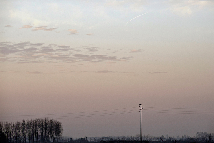 Uno scatto minimale ma molto bello con il gruppo di alberi sulla sx bilanciati a dx dal palo elettrico, il tutto sotto un cielo dalle belle tonalità pastello _________________ Giuseppe |