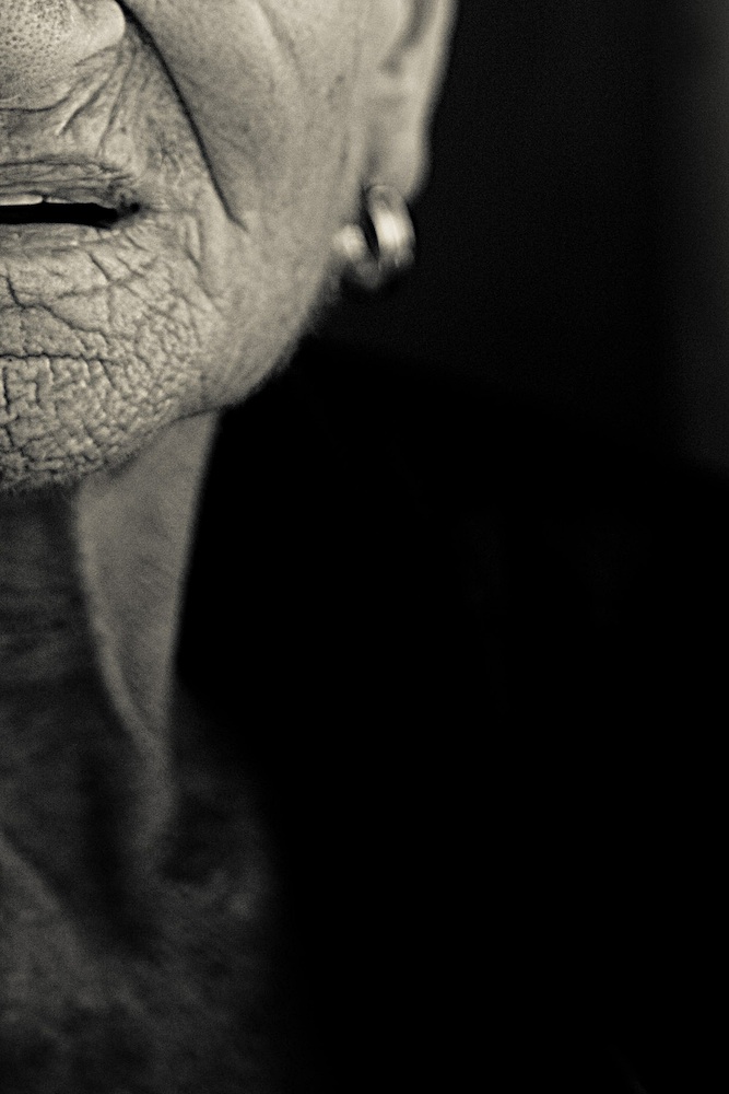 interessante questo ritratto, dicono che in un viso la bocca, sia un elemento importante per cogliere i pensieri delle persona, in questo caso, la verticalità della composizione, con lo spazio dedicato al collo, nella parte inferiore della foto, la pdc, l'oscurità, e i pattern del viso, portano da un'altra parte, creando un effetto straniante. C'é quasi della pornografia, nel gesto dell'obbiettivo quando vuole penetrare negli interstizi della pelle.