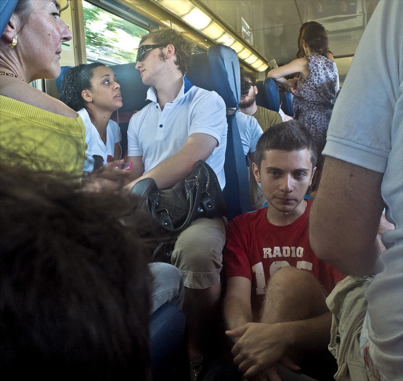 Crea un altra composizione: il ginocchio, punta al viso del ragazzo, che non é un incontro diretto, ma una presenza che ammicca tra il braccio e i capelli sulla sinistra, altri elementi e maggiore confusione: venendo percepito come una porta per entrare nel mondo ciacolante del vagone. Il soggetto ambiguo é la donna, che guarda con la coda dell'occhio, cosciente e superficialmente intrigata dalla ripresa. La coppia che parla di fronte sono due altre presenze forti. Sono d'accordo sulla pdc.