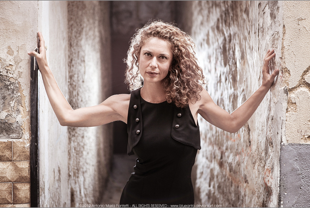 Ci sbarra la strada Tiziana ...e lo fa con una dinamica espressiva del corpo che ci parla di forza e sensualità insieme, ...come di chi non ammette repliche al proprio sguardo e allo stesso tempo coinvolge e disarma con la dolcezza di un leggerissimo sorriso. La gestualità è ferma, ...risoluta, ...consapevole eppure il corpo sbilancia di lato in una nota di sinuosa sensualità che pare fare eco allo sguardo che ammicca, ...interroga e vince.