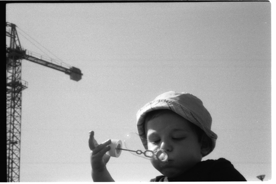 mi piace la pastosità della composizione: sembra analogico. La chiave é la rima tra il braccio della gru, e il braccio del gioco delle bolle. Avrei eliminato il cartello a sinistra.