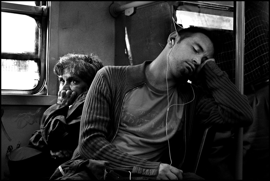 la coscia è una grande "cosa" (meglio di qualsiasi treppiede) per "rubare" foto nei mezzi pubblici e non solo lì (io la uso molto spesso!...). Bello scatto con due personaggi differenti, ma entrambi interessanti. Adeguato il BN contrastato ( e per me sempre, o quasi sempre, da privilegiare, intendo ilk contrasto). Peccato per la bruciatura sotrto l'occhio. Ciao _________________ Ilio |