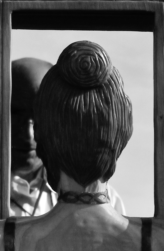 spiazzante, ancora di più se seguo la distinzione a spiegazione tra turisti-viaggiatori-pellegrini. Forse un crop, da quì il rumore. Mi aspetto uno specchio, ma non so chi si riflette, e se fosse uno specchio, non trovo traccia del fotografo. e alter ego, ma chi é alter ego di chi ? e allora seguo la strada della dimensione parallela, dove l'umano é l'ater ego, del manichino, ma non é un manichino perché é evidente una presenza. Un pellegrinaggio sicuro, ma alzandosi in piedi sul romanzo di l. carroll per vederci meglio.