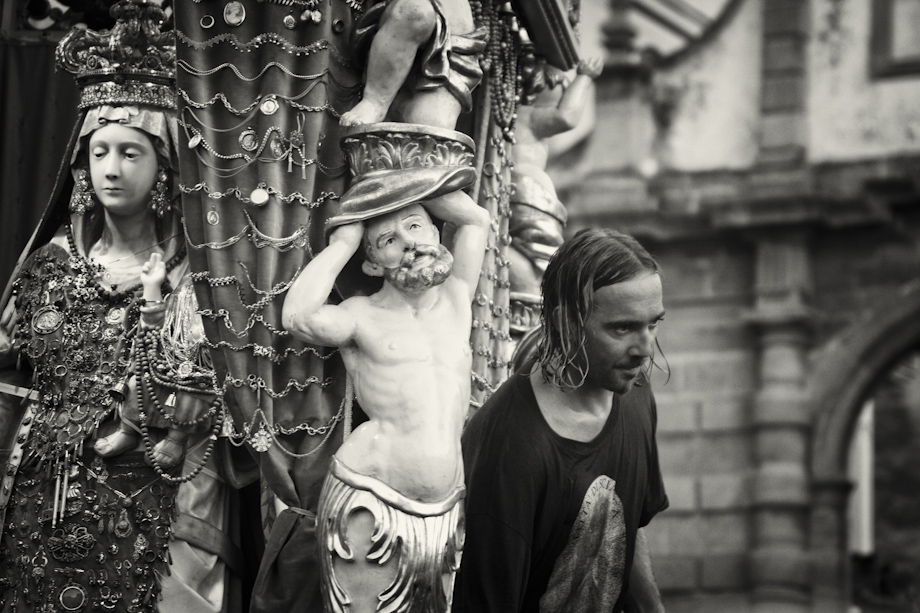 Il Portatore è quasi indistinguibile dalle statue, quasi a rappresentare una perfetta comunione.