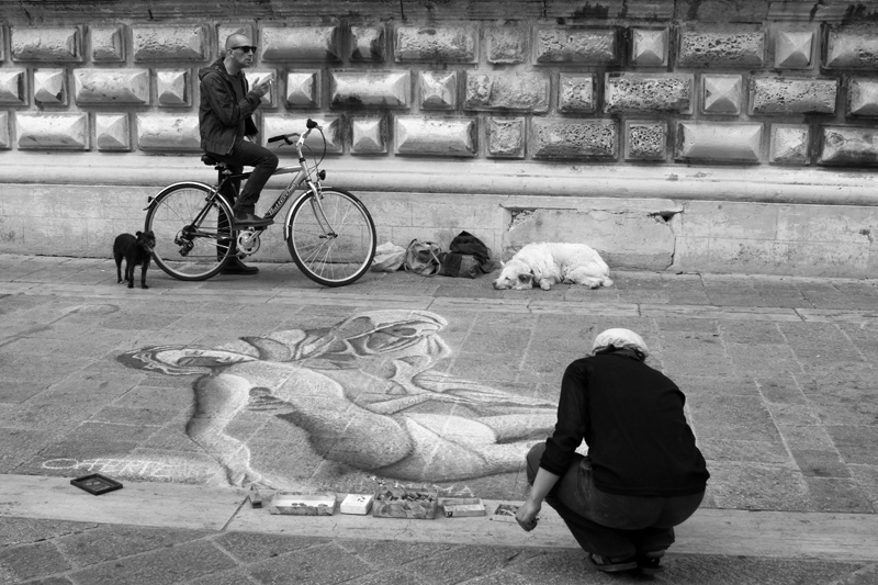 Questa scena cittadina é colta con una composizione pulita, sostanzialmente priva di elementi di disturbo. Se questo scatto ha un punto debole, direi che é il fatto di includere diversi potenziali elementi di interesse (che si possono raggruppare i due "macro-soggetti": madonnaro con la sua opera e ragazzo in bicicletta attorniato dai cani), senza peró dare prevalenza ad uno di essi. In pratica la scena é documentata in maniera un po' troppo "neutra" (tutto a fuoco, ripresa dall'alto che non enfatizza il gesto del pittore). Credo che in questo caso il colore avrebbe aggiunto un motivo di interesse in piú.