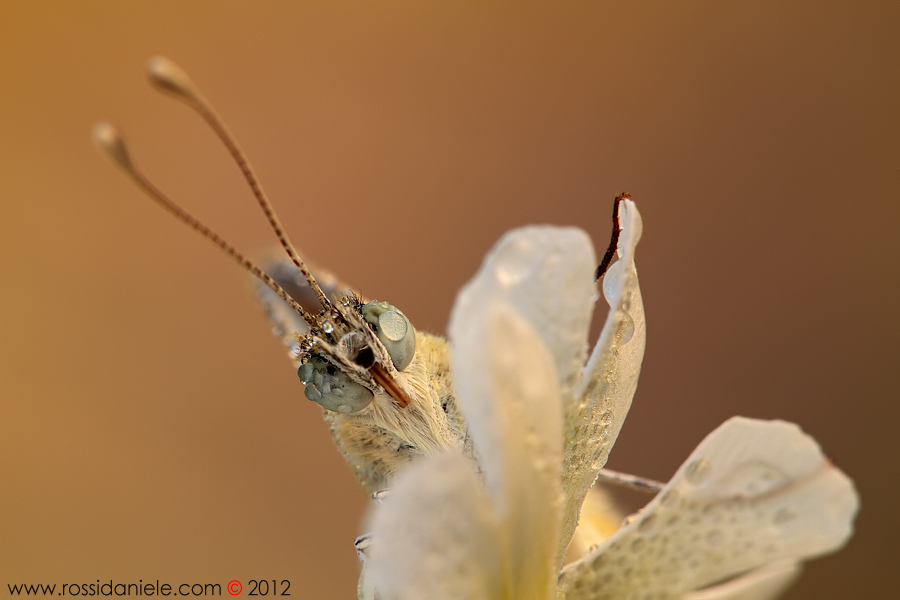 Ciao Daniele, cromie calde e piacevoli...fanno da contorno ad un soggetto dettagliato in maniera superba, gli ommatidi degli occhi ingranditi dall'effetto lente dato dalle goccioline di rugiada la dicono lunga, bella la composizione e curioso il punto di ripresa...creativo, bravo.