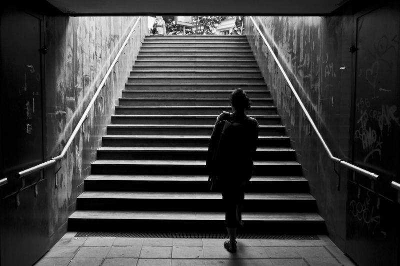 Il primo istinto è stato immaginare lo scatto che non mostrasse l'uscita (della ragazza e del nostro sguardo) e si fermasse appena al di sotto del gradino più alto.
