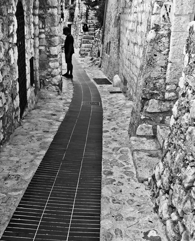Curioso il b/n con la persona fin troppo nera, quasi a volerla rendere non identificabile, una silhouette tra i grigi e i bianchi. Le mattonelle del selciato portano l'attenzione verso la figura umana tramite appositi binari interrotti (peccato Triste ) dal tombino.