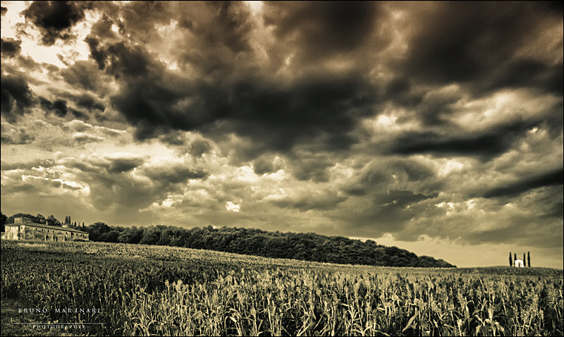 Solo due piccoli appunti Bruno, avrei evitato di enfatizzare il viraggio nella pare alta del cielo e a livello compositivo avrei dato leggermente più respiro al casolare a sx poiché risulta troppo a ridosso del bordo del frame. |