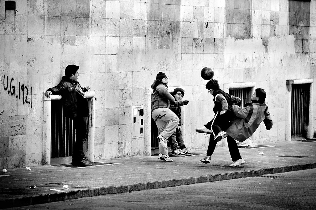 | il momento colto, l'inquadratura e il bianconero ci offrono uno scatto che ha il sapere della vita, della "pallastrada" una gran bella street photo |