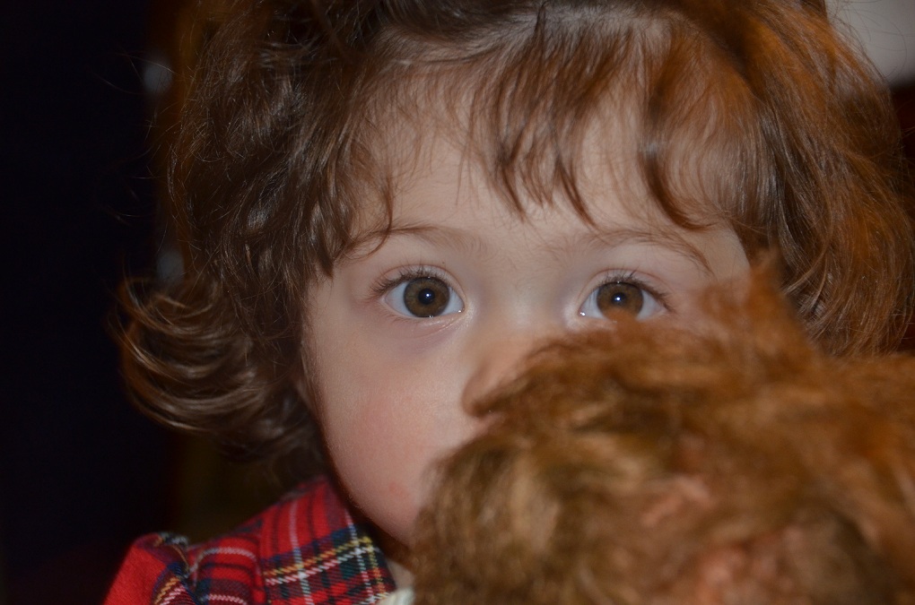 Il primo piano sfuocato della testa del bambolotto (credo) ...proprio non va, ..."impalla" come si suol dire il bel viso della piccina e "sporca" la lettura proprio degli occhi che sono il centro di interesse visivo ed emozionale dello scatto.