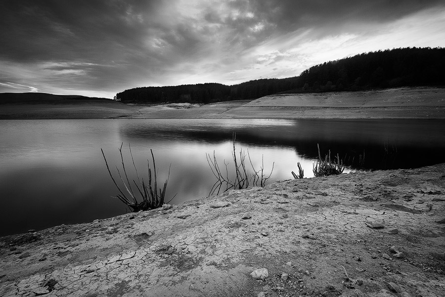 I cespugli ormai secchi che si stagliano su quell'acqua che sembra un tessuto finemente ricamato, in primo piano un terreno secco e screpolato nitidissimo, e la, sullo sfondo, un paesaggio desolato ma intrigante composto da dolci dossi e un'ordinata fila di scuri alberi... bella davvero!