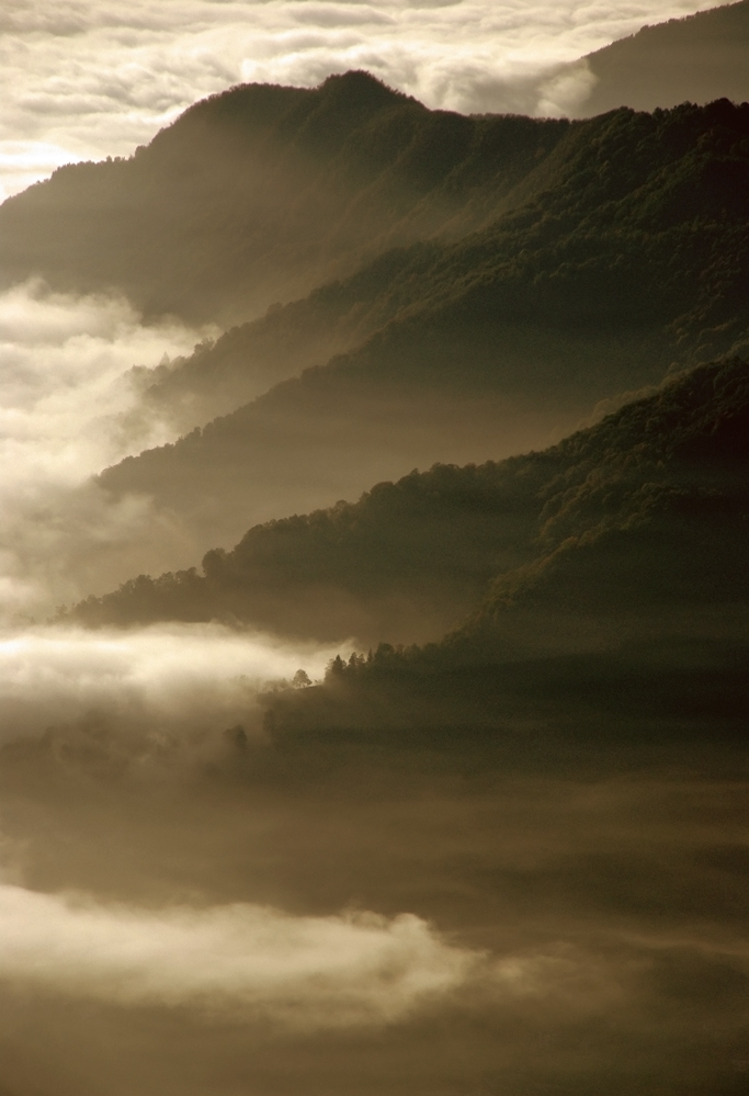 Un buono scatto. Hai sfruttato al meglio le condizioni atmosferiche per ottenere un'immagine fascinosa, nella quale diversi piani marcati dalla luce ma ammorbiditi dalla nebbia si susseguono fino al mare di nuvole dello sfondo.