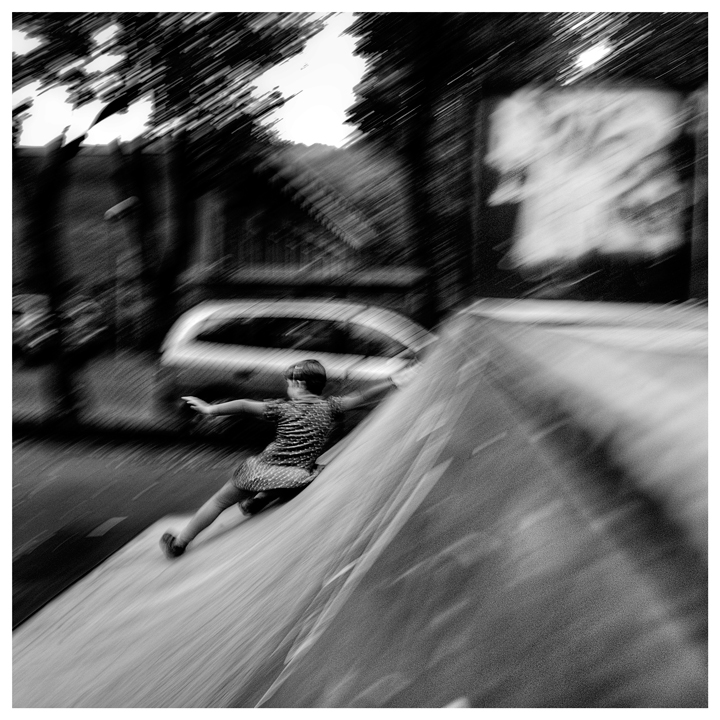 In effetti l'auto disturba, ma la tecnica è efficacissima, e ottimo il b&n, che definirei "dinamico"!