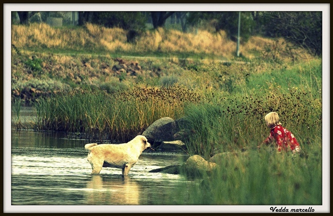 Tutto un po' troppo piccolo, in effetti, e un po' tendente a scivolare verso destra. Il momento colto poteva essere più interessante, con il cane in altro atteggiamento ed il gesto della bimba meglio visibile. Piacevoli anche se irrealistiche le tonalità