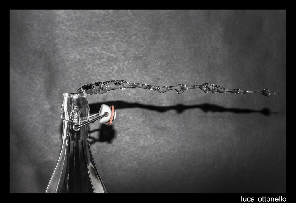 Grazie per il chiarimento e per la critica...gradita perché costruttiva... Comunque la foto non è ruotata....la bottiglia è montata su un binario dove scorre (in piedi) per circa 25 metri, grazie a questo movimento la bottiglia raggiunge i 100km/h circa ...il liquido esce per l'accelerazione e questo spiega perché il tappo sembra andare contro le leggi gravitazionali. Non volevo svelare il 'trucchetto' utilizzato...ma mi hai costretto a svelare i miei piccoli trucchi...  |