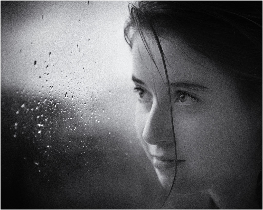 bellissimo quel ciuffo di capelli che divide a metà uno sguardo prezioso che si rivolge sereno e fiducioso al futuro. bellissimo il bn ricco di sfumature, così come quel vetro screziato di pioggia che completa il quadro con la sua texture romantica.