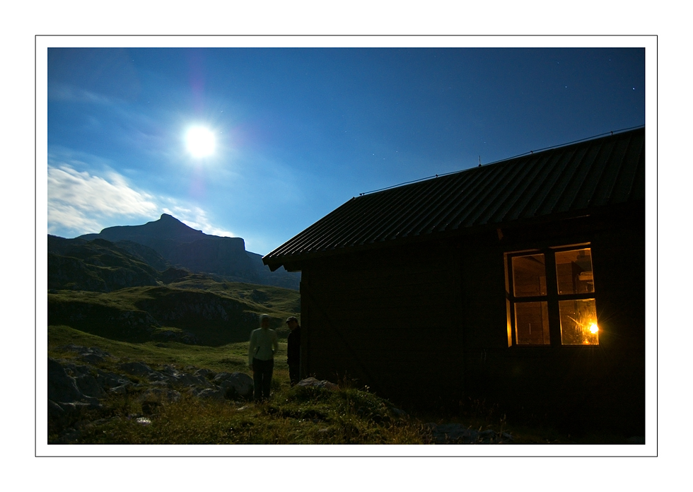 Cosi', se non fosse per la luce dentro il bivacco e le stelline a destra, sembrerebbe quasi una foto di giorno non ben riuscita. Magari con un po' di luminosita' in meno esponendo qualche secondo di meno...