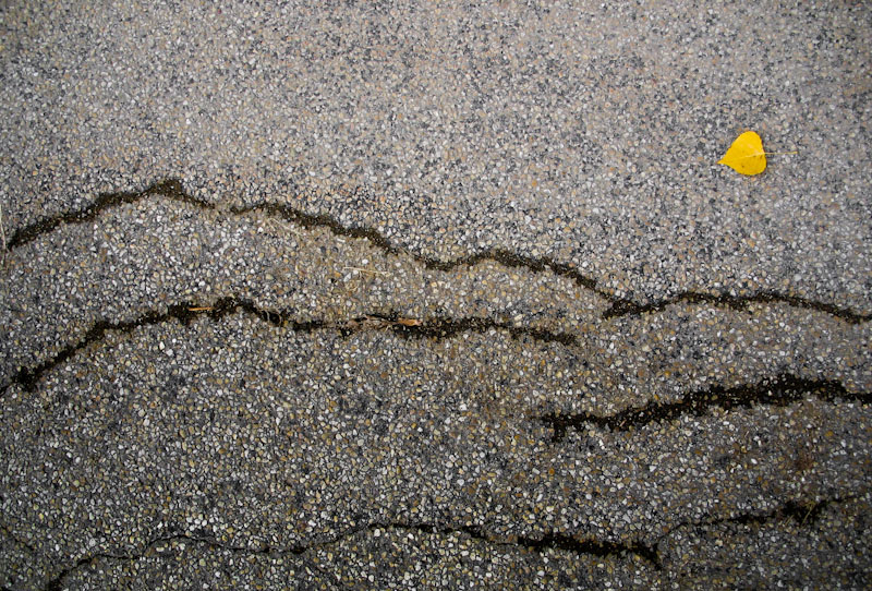 Non la vedo molto nitida però ammetto che mi intrigano quelle crepe sinuose e la giallissima fogliolina di Pioppo che contrasta col grigio quasi uniforme della pavimentazione.