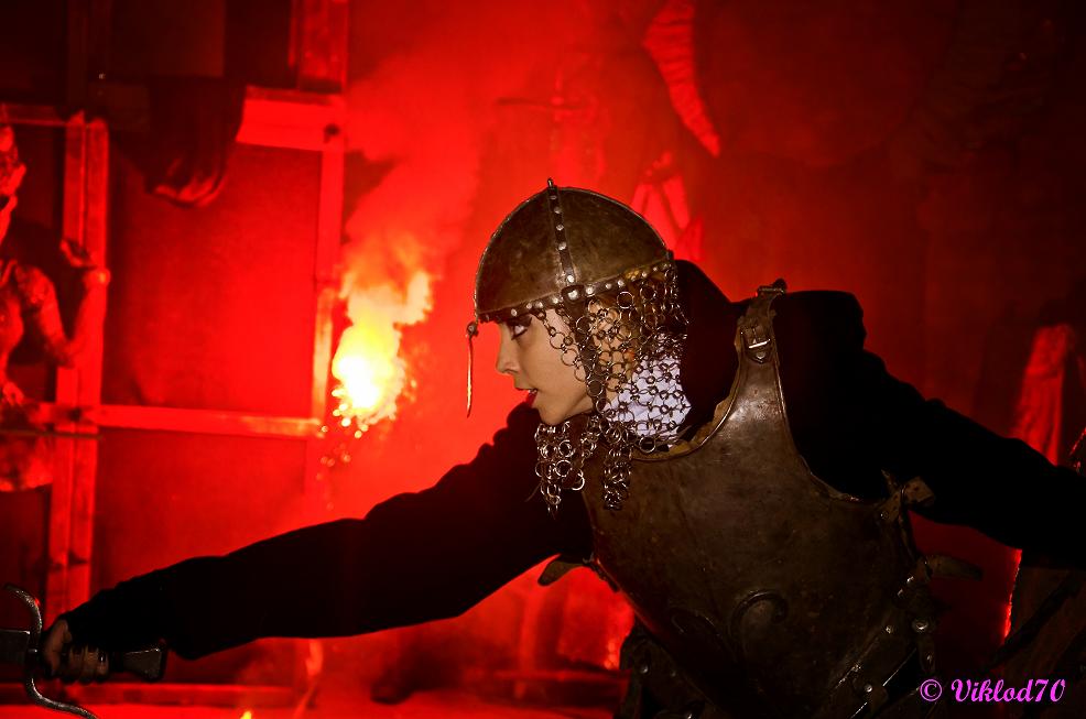 L'inquadratura: taglia fuori la spada, che non è particolare di poco conto; sicuramente sarai stato condizionato dal rapporto tra distanza e focale disponibile, ma potevi - se proprio dovevi - tagliare all'altezza della spalla sinistra della ragazza e rinunciare alla parte posteriore. Secondariamente vedo anche troppa aria in alto.