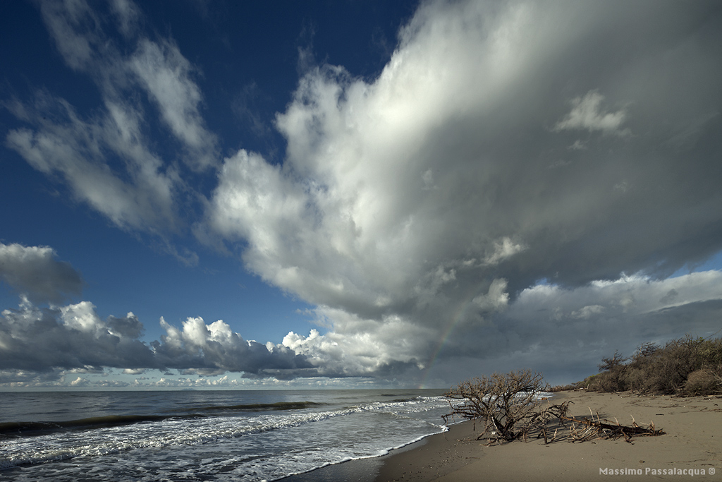 Bravissimo Massimo: la consistenza, la qualità visiva di questa immagine, ha del cristallino, con una brillantezza quasi metallica, nei riflessi in tono blu, che si allargano sulla ampia veduta marina. Composizione perfetta per accogliere il relitto di ramo al centro, e soprautto lo straordinario arcobaleo che quasi pudico fa la sua comparsa al cuore centro del fotogramma verso l'orrizzonte.