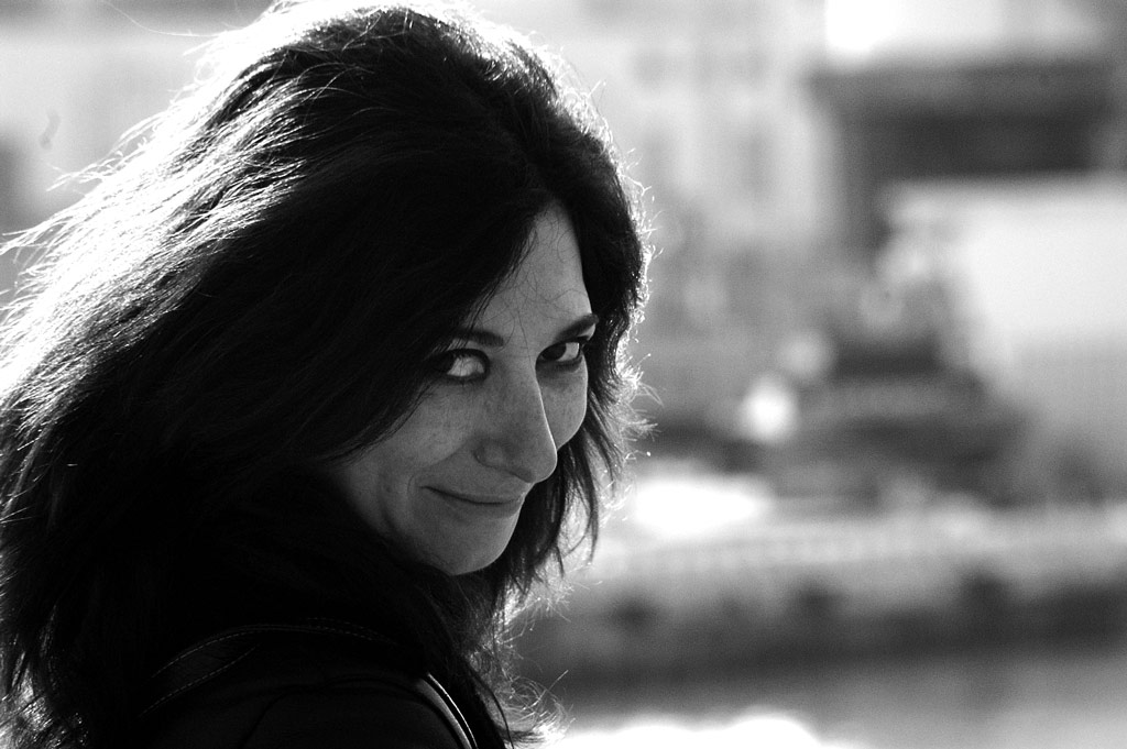 Trovo ven gestito il BN del volto, meno il controluce dei capelli, che sparano troppo, ed i dettagli che non sileggono sullo scuro dei capelli non illuminati. Gli edifici dello sfondo, ben sfuocato, mi sembrano storti; riguardo al taglio eliminerei una fettina a destra.
