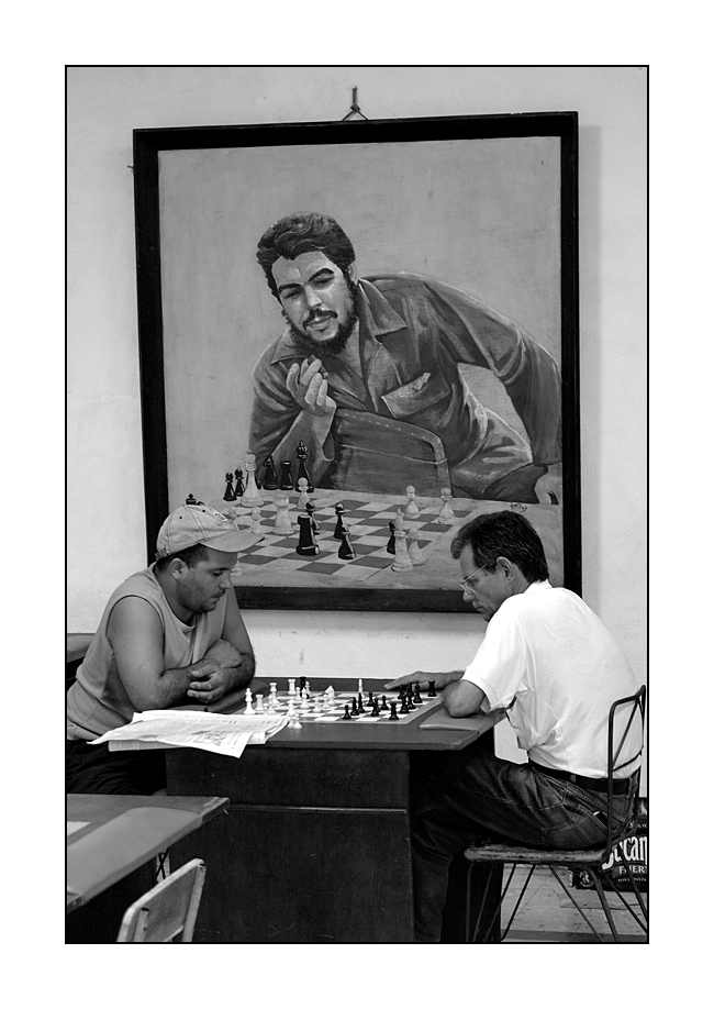 Per enfatizzare il rapporto tra i tre personaggi e le due scacchiere eliminerei la parte sotto, con elementi di disturbo, replicando il taglio della tela.