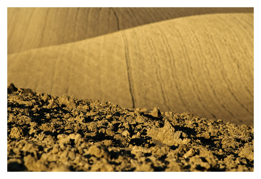 L'idea dii associare queste due aree di campo a mio gusto è davvero vincente.Si tratta dello stesso campo eppure si alternano il caos delle zolle e la geometrie ondulata della terra pettinata da sottili solchi. Quello che trovo magari più criticabile è la scelta di diaframma: che ti regala una zona di dettaglio solo parziale sullo scuro e una indeterminatezza progressiva in avanti alla luce piena. A mio parere il contrasto fra le due materie è il protagonsita, per cui avrei trovato perfetto un tutto a fuoco, nitido e tagliente.