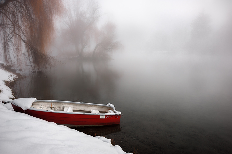 ancora una buona immagine con atmosfera di pieno inverno. la barca introduce una nota di colore nel paesaggio innevato . Mi piace il progressivo scomparire degli alberi nella nebbia