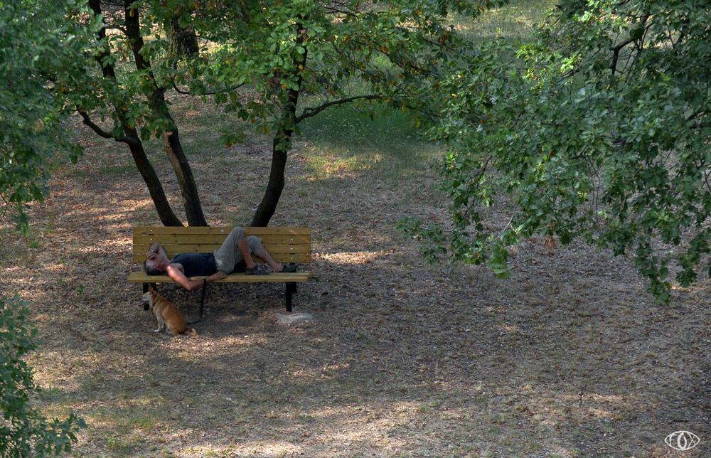 Una foto dove è visibile un buon occhio nel disporre gli elementi, cornice/3 fusti scuri/panchina e soggetti.
