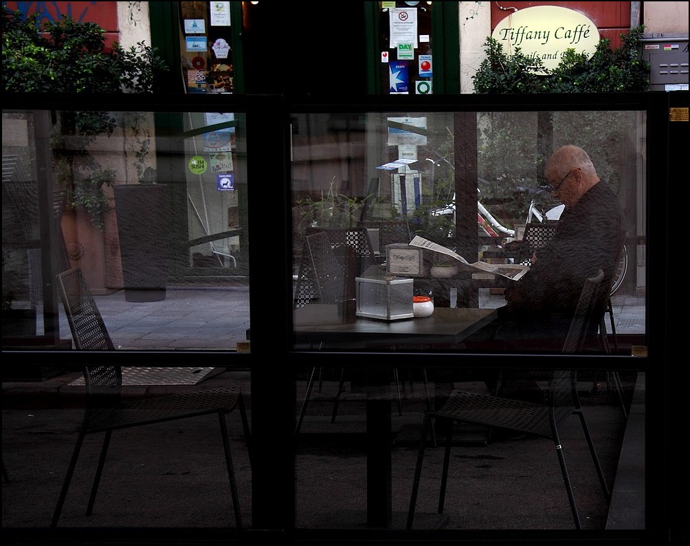3°)Mi piace fotografare gli avventori dei bar, direttamente o attraverso i vetri, o anche riflessi. Spesso lo faccio. Confesso che quando ho scattato, non avevo notato l'insegna Tiffany. Me ne sono accorto solo quando ho convertito il file RAW e ho pensato di "sfruttarla" nel titolo, parafrasando quello di un vecchio film primi anni 60 con Audrey Hepburn e dell'omonimo romanzo di Truman Capote. Per per me la foto ha la stessa valenza con quel titolo, con un altro, o...senza! E' la solita storia dei titoli che, in generale, non dovrebbero condizionare il giudizio su una foto (per me)...