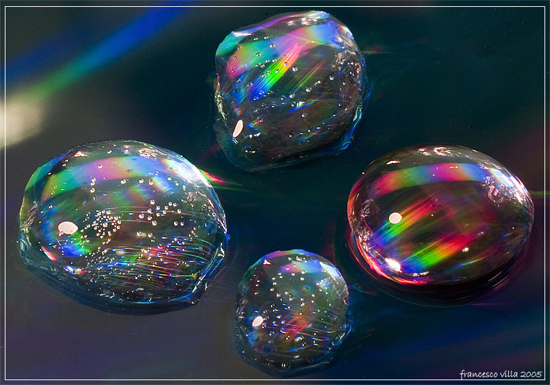 gocce su un cd, lampada radente da sx e carta stagnola a destra... e mi sono dimenticato di spegnere il lampadario, guardate che bozzo bianco sulle gocce