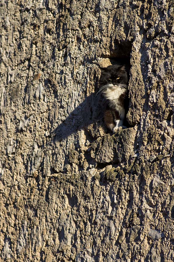 È comune in anfratti del genere vedere dei piccioni... ora la domanda è: come mai il pennuto non appare e perché il gattone ha l'aria satolla?