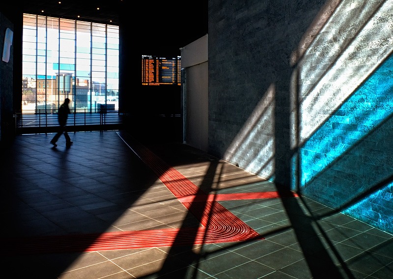 Molto bella! Luce eccellente per disegnare questo reticolo fatto di ombre, geometrie, colori, percorsi. L'uomo è colto al passaggio nel punto più giusto. C'è tutto. Gran bella foto.