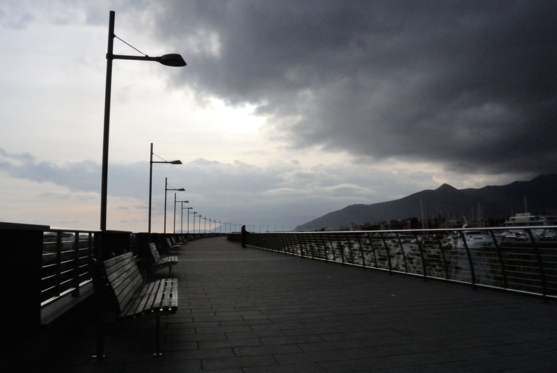 con st...si poteva parlare di linee di fuga..del binomio tra panchine e lampioni...e anche di meteo...con quelle nuvolacce nere...!!